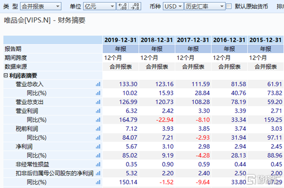 根据唯品会2019年的年报披露,公司的去年整体营收133.3亿美元,虽然增长仅有10%,但净利润上升到了5.67亿元,与上年同期增长了85%,并创下了上市以来最高的记录。