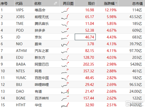 美股的强势也刺激了中概股的集体走强,大部分明星中概股都涨势可观。其中国内几大电商巨头涨幅最为惹眼,唯品会盘中大涨超12%领涨,拼多多涨4.67 %,京东涨4.4%,阿里巴巴涨了近3 %。