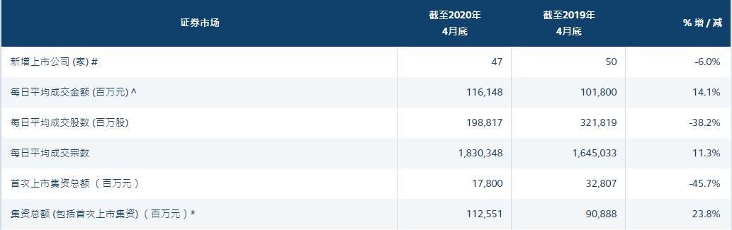 证券市场市价总值于2020年4月底为35.0万亿元,较去年同期的34.3万亿元上升2%。