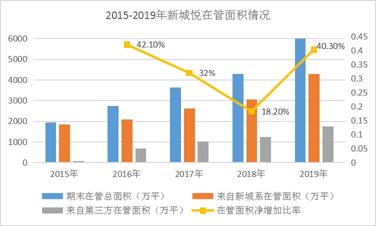 数据显示,2015年至2019年,新城悦服务来自第三方在管面积的年复合增长率达到216.43%,其中2015年为79.1万平方米,占总在管面积的比重为4.09%,2016至2019年的占比提升至20%以上,分别为24.33%、27.84%、28.95%以及28.85%。