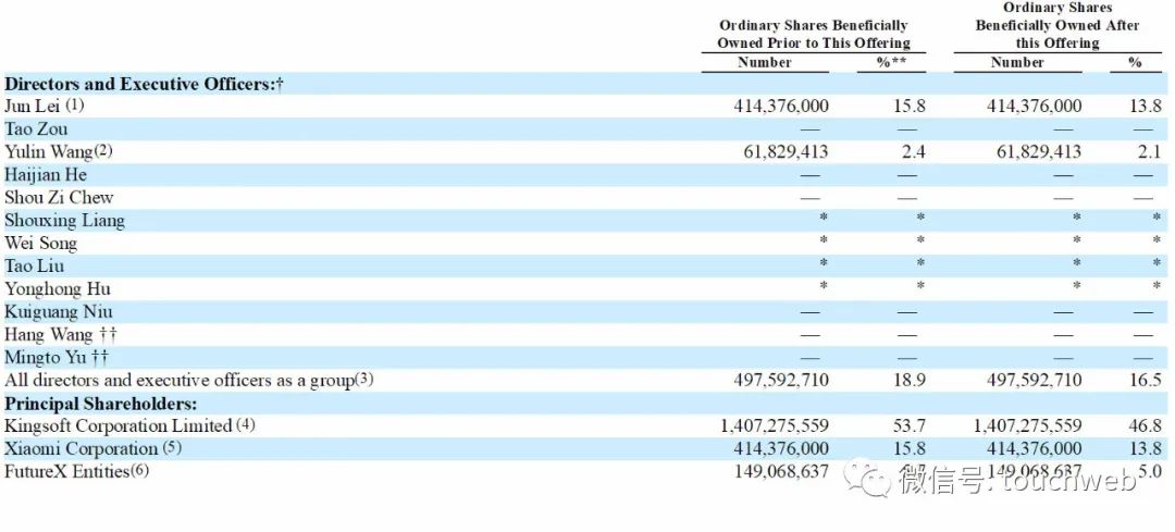 IPO后,金山软件持股降至46.8%,小米持股降至13.8%,FutureX Entities持股降至5%,王育林持股降至2.1%。
