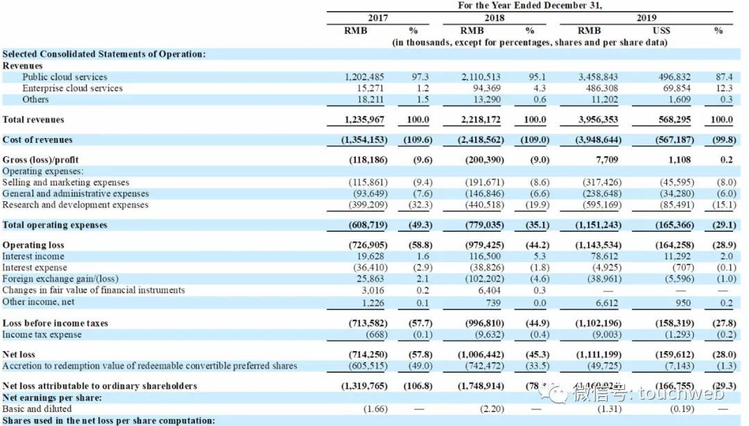 金山云2017年、2018年、2019年利润分别为-7.27亿元、-9.79亿元、-11.43亿元;Adjusted EBITDA分别为-3.38亿元、-5.2亿元、-4.17亿元。