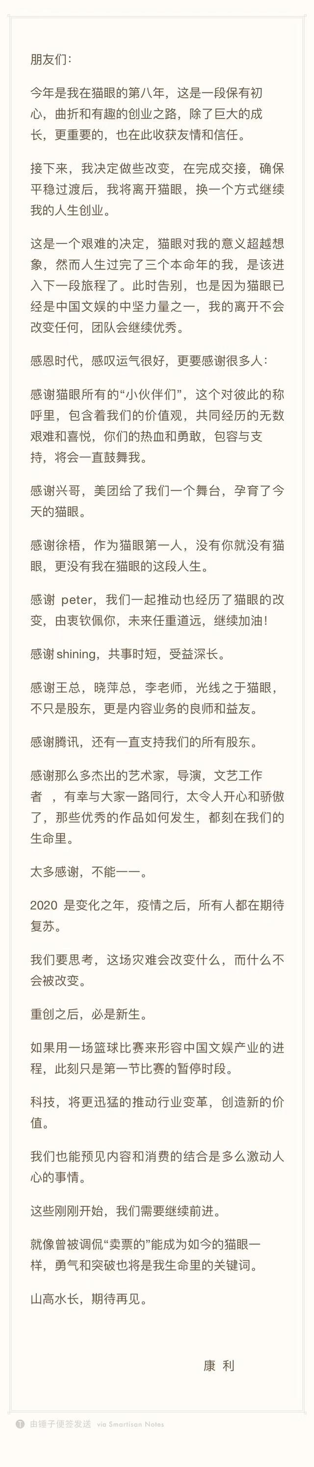 针对此消息,猫眼方面公开回应称,康利因个人发展需求,将辞去猫眼娱乐COO职务,转为担任公司顾问,继续陪伴猫眼成长。