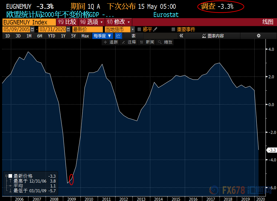 以欧元区一季度GDP年率为例,即使是符合预期的同比预期下降3.3%,这也将是2009年二季度以来最差表现。