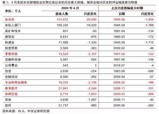 公共卫生事件冲击下的美国4月新增非农就业创历史最大跌幅。公共卫生事件对服务业就业冲击十分显著,永久性的结构冲击值得关注,同时对调查方法的冲击也使得就业数字存在低估。预计美国失业率在二季度仍将维持高位。