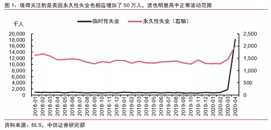 就业结构来看,更值得关注的是公共卫生事件对就业造成的永久性冲击。从就业结构来看,临时性失业人数为1800万,贡献了总就业人口减少的80%,是前一个月的10倍,这主要体现了公共卫生事件对就业结构造成的一次性冲击。但更值得关注的是永久性失业也相应增加了50万人,这也明显高于正常波动范围(图1)。同时从劳动参与率来看,此次劳动参与率为60.2%,相对3月下降了2.5%,这是自1973年以来的最低水平,如果加上由于公共卫生事件冲击可能退出劳动力市场的65.7万人,累计可能造成的真实永久性失业人数已经超过百万。