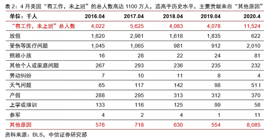 调查方法来看,公共卫生事件的冲击使得4月非农数据部分低估了就业的下滑。公共卫生事件增加了BLS进行就业调查的难度,导致需要面谈的调查无法开展,也降低了样本的回收率(仅为70%,比正常水平低13%)。同时BLS公布的样本分类中共有1100万人处于“有工作,未上班”的状态,但从没有上班的原因来看,近70%(将近750万人)为BLS统计的“其他原因”(表2),如果把这部分人口统计为临时性失业人口,失业率将攀升近5%至19.2%。