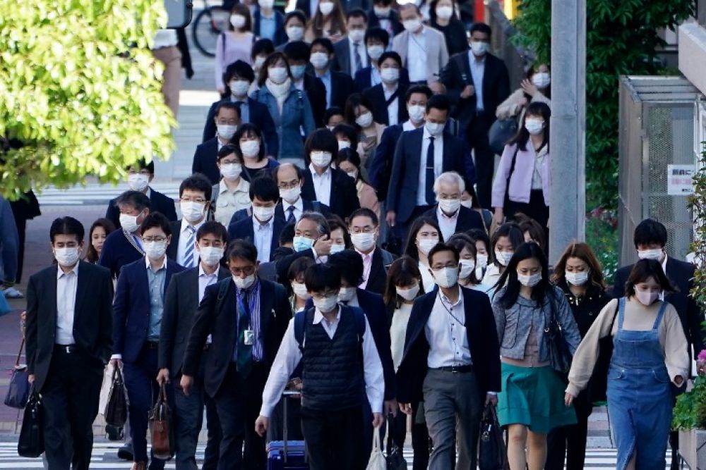 5月7日,在日本东京,佩戴口罩的人们走在早高峰上班路上。新华社/美联