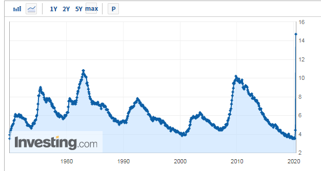 新冠肺炎疫情对美国经济的全面冲击,随着美国4月非农就业报告揭晓展现在世人面前。上月美国非农就业人数减少了2050万人,创史上最大降幅,失业率飙升至14.7%,创1940年代以来最高水平。