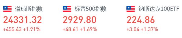 道指上周五收盘上涨455.43点,或1.91%,报24331.32点;纳指涨141.66点,或1.58%,报9121.32点;标普500指数涨48.61点,或1.69%,报2929.80点。