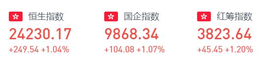 上周五收盘,恒生指数涨249.54点或1.04%,报24230.17点,全日成交额达968.2亿。国企指数涨1.07%,报9868.34点,红筹指数涨1.2%,报3823.64点。