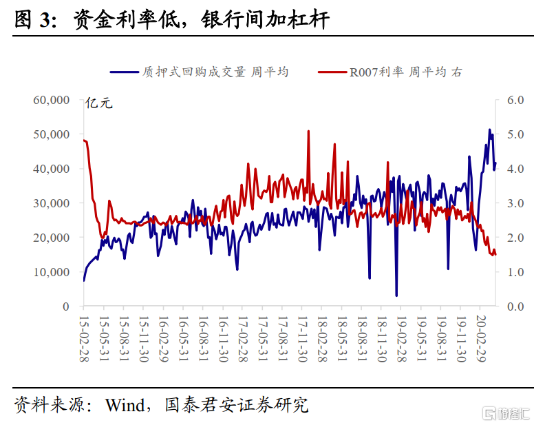 对下一阶段货币政策定调为,重申“更加”灵活适度,点明调控具有“前瞻性”。对冲疫情以来,银行间资金利率不断创新低,市场隔夜回购成交大幅放量,市场狂欢之余也会对货政边际收紧有所担忧。根据央行数据,3月末,金融机构超额准备金率为2.1%,较2019年同期高0.8个百分点;而从措辞来看,此次报告删去了“坚决不搞大水漫灌”的描述,或意味着,为应对“前所未有”冲击,央行对资金利率持续低位的容忍度有所上升。
