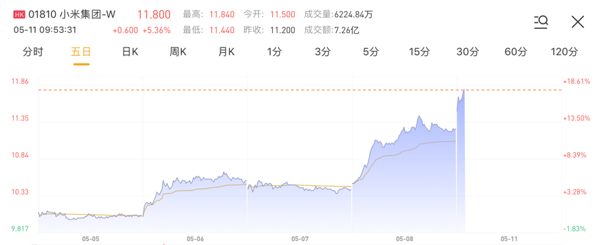 华盛资讯5月11日讯,受金山云首日大涨超40%等利好消息推动,小米集团-W(01810)一度涨近6%。截至发稿,小米大涨5.36%,现报11.8港元每股,当前成交额7.26亿港元,总市值达2828亿港元。