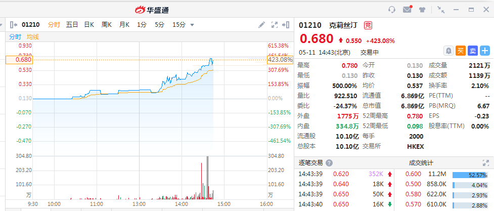 智通财经APP获悉,细价股克莉丝汀(01210)午后获资金爆炒,股价逐渐攀升,盘中高见0.78港元,创两个半月新高。截至发稿,涨423.08%,报0.68港元,成交额1139万港元。
