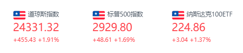 上周五,美股高开高收。截至收盘,标普500指数涨48.6点,涨幅1.69%,报2929.8点;纳指涨141.7点,涨幅1.58%,报9121.32点;道指涨455.4点,涨幅1.91%,报24331.32点。