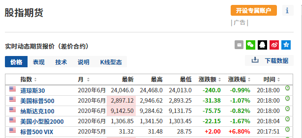 股指期货跌幅扩大,标普500指数期货跌1.07%