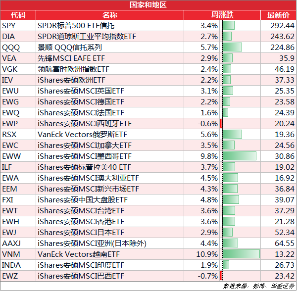 越南ETF仍旧是波动最高的国家ETF,上周再次大涨11%领涨,其次是墨西哥,涨幅近10%。