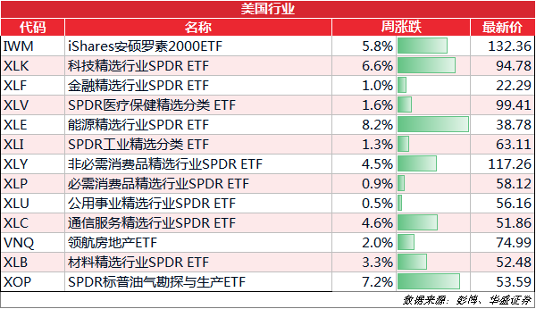 从行业来看,能源精选、油气勘探和生产连续多周是表现最好的板块,相关ETF分别涨8.2%和7.2%。