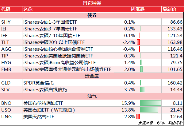 油价继续大幅反弹,布油ETF和美油ETF分别大涨16%和14%,原油抄底客终于迎来“春天”,而其他商品和债券ETF则表现平平。