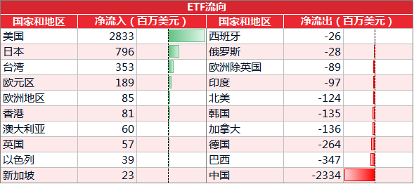 按国家和地区区分,美国和日本依然是流入最多的两个国家,但这次是日本的流入规模大幅减少,从18亿美元缩减到8亿美元。