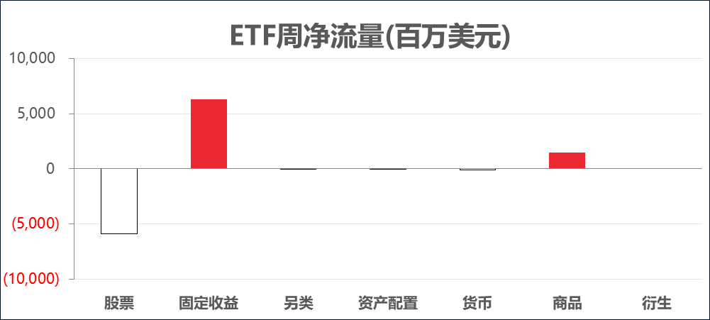 上周股票类ETF继续大幅净流出,大约62亿美元逃出股票类ETF,已是连续第3周流出;商品和固收类的流入幅度也些微下降,但总体仍与前一周保持平稳。