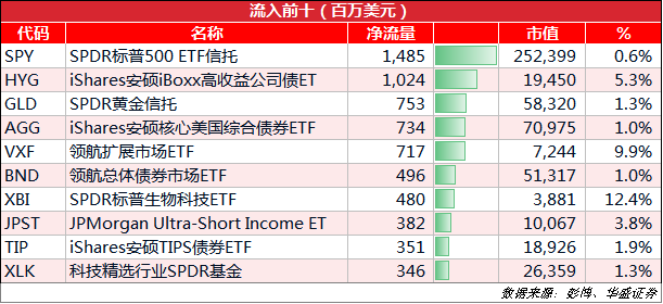 美股向好,最大的标普500ETF SPY终于回到净流入榜首,而前十名单中,股票类ETF的席位也有所上升,生物科技和科技精选行业基金最被看好,而此前一周,标普生物科技ETF XBI还遭到市场抛售。