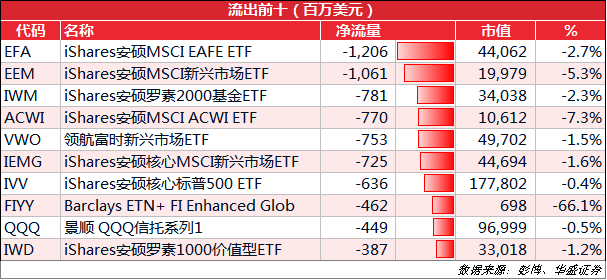 新兴市场似乎成了不被看好的主题,流出前十榜单里占据了不少的席位,三大新兴市场ETF纷纷上榜,同时,流出前十的ETF中,几乎全是股票类ETF。