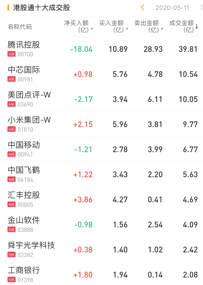 今日,南下资金净买入汇丰控股3.86亿港元,净买入中国飞鹤1.22亿港元,净买入小米集团2.15亿港元。腾讯控股遭净卖出18.04亿港元。