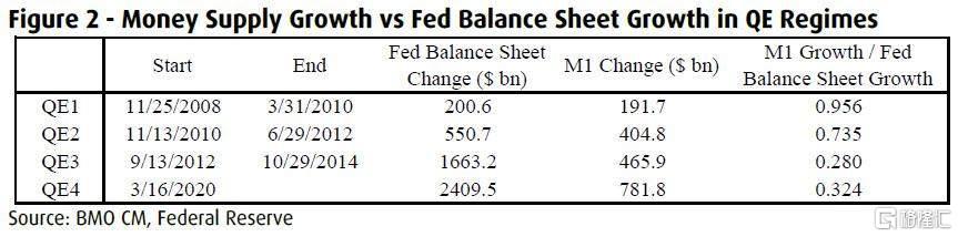 QE1非常有效,令美国成功摆脱经济衰退。QE1阶段中,每「放水」1美元,M1货币供应增加0.96美元。但从QE2开始,我们可以看到边际效用正在递减。QE2对M1的转化程度只有0.735;而到了QE3,相关性已经骤降到只有0.28美元。从这个角度来看,量化宽松对实体经济的影响随着时间的推移而减弱。