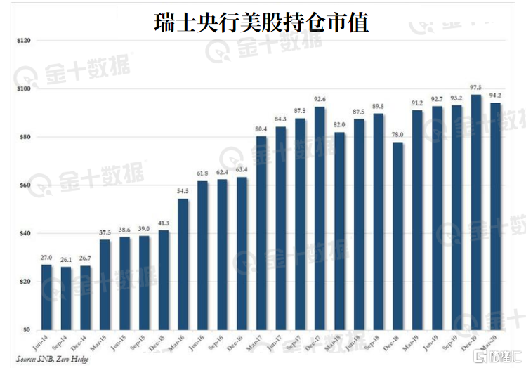 数据显示,在过去5年里,瑞士央行所持有的美国股票的价值增长了3倍多,从2014年12月的267亿美元增长到2019年12月的975亿美元。而在2020年第一季度,股市触及历史高点后在3月份暴跌超30%。