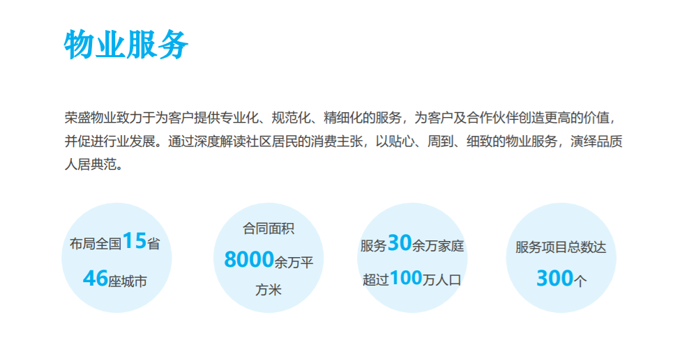 同时,截至2019年末,荣盛物业布局了全国15个省的46座城市,合同面积为8000余万平方米,服务项目总数达到300个,服务30余万户家庭,超过100万人口。