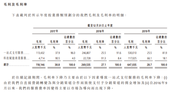 招股书显示,移卡的收入来自一站式支付服务(基于应用程序的支付服务及传统支付服务)及科技赋能商业服务(包括金融科技服务及营销服务等)两大部分,从其收入构成上来看,一站式服务一直是公司主要的收入来源。于上述业绩期内,一站式服务的收入占比至少超过97%。但从毛利率方面来看,公司科技赋能商业服务业务的毛利率远高于一站式支付服务业务。2019年,一站式支付服务毛利率仅为25.5%,但科技赋能商业服务的毛利率高达66.1%。