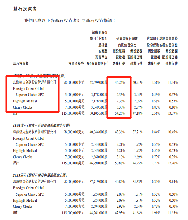 此外,公司与若干基石投资者订立基石投资协议,基石投资者已同意按发售价以合共1.15亿美元认购若干数目发售股份。其中,珠海格力金融投资管理有限公司(珠海格力)拟认购9800万美元,Foresight Orient Global Superior Choice SPC拟认购500万美元,Highlight Medical拟认购500万美元,及Cherry Cheeks拟认购700万美元。