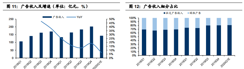 在短视频类应用竞争下,预期社交广告收入增长低于信息流广告的增长。媒体广告受疫情影响预计继续负增长,但其占比较小,对整体影响不大。
