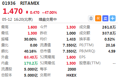 华盛资讯5月12日讯,动物饲料添加剂产品制造及分销商Ritamix Global(01936-HK)暗盘高开30%,截至16:20报价1.47港元,涨幅47%,最高涨60%。最新成交额387万港元,总市值为7.35亿港元。公开配售申购人数6584名,一手中签率30%,认购倍数约5.33倍。