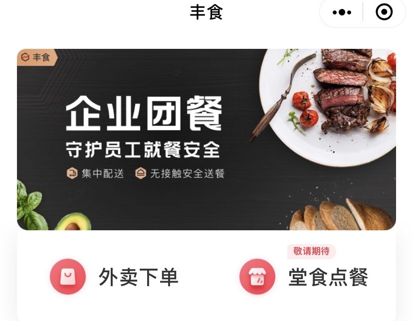 “丰食”的小程序页面,可能因为是公测版的缘故,显得比较简单。第一次打开申请使用用户的定位信息。封面 Banner 的大海报显示了其主打的“企业团餐”。在“加入我们”一栏中,商户入驻按钮下有说明文字,“免费上线,轻松单量翻倍”。