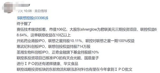 据雪球投资者统计,目前联想在投和旗下公司陆续迎来上市潮,包括即将赴港上市的诺辉健康、华文食品、开拓药业以及科创板赛伍技术继续封涨停,寒武纪、圣湘生物等陆续科创板IPO,联控战略投资板块的东航物流和联泓新材料也有望在今年拿到IPO批文。