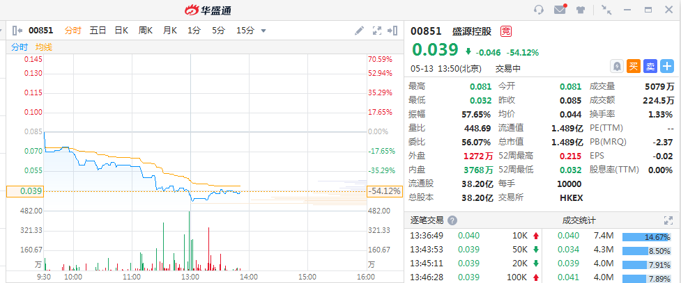 盛源控股(00851)发布公告,公司接获联交所通知,将根据上市规则第6.01(3)条暂停公司股份买卖。该股早盘单边下跌,午后一度跌超60%,截至发稿,跌54.12%,报0.039港元,成交额224.5万港元。
