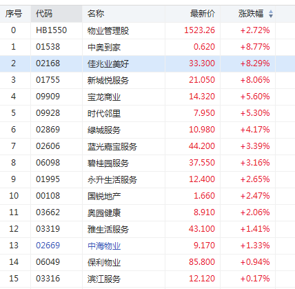 物管股普遍造好,新城悦服务(01755)飙8.06%,报21.05元;蓝光嘉宝服务(02606)升3.39%,报44.2元;碧桂园服务(06098)扬3.16%,报37.55元,创上市新高。
