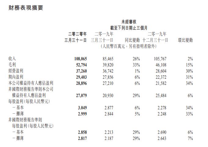 2020年第一季度收入为1080亿元人民币,上年同期为854.65亿元,同比增长26%。