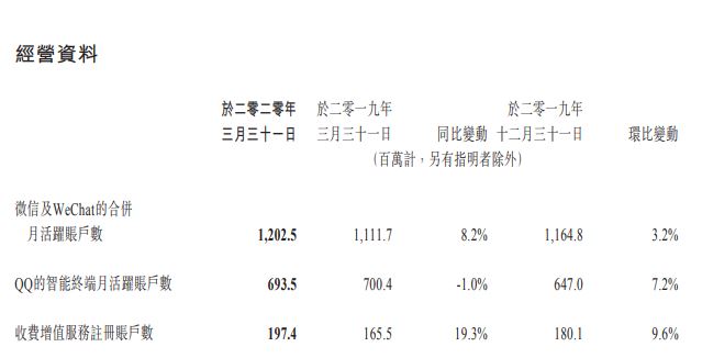 截至2020年3月31日,QQ月活跃账户数为6.935亿,去年同期为7.004亿,同比减少1.0%,环比增加7.2%。