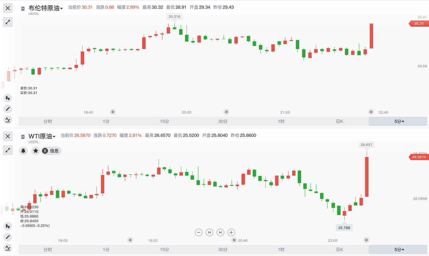 美、布两油持续走高,WTI原油7月期货短线涨0.5美元,现报26.57美元/桶,布伦特原油期货现报30.33美元/桶,日内涨超1%。