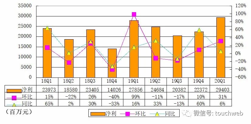 腾讯2020年第一季度期内盈利为294.03亿元(41.50亿美元),同比增长6%;净利润率由2019年同期的33%下降至27%。