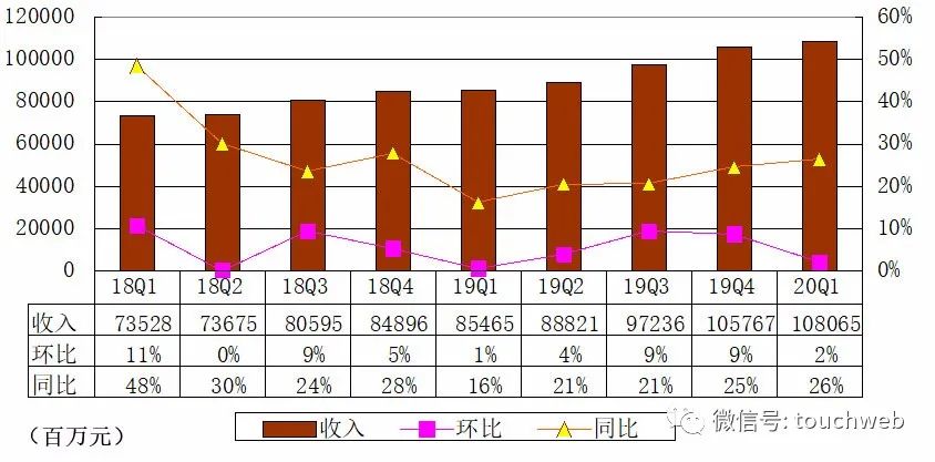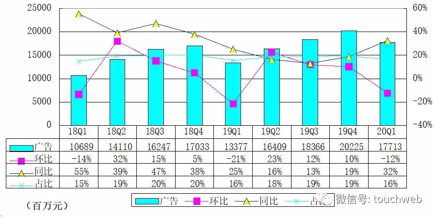 腾讯2020年第一季度网络广告业务收入177.13亿元,同比增长32%。