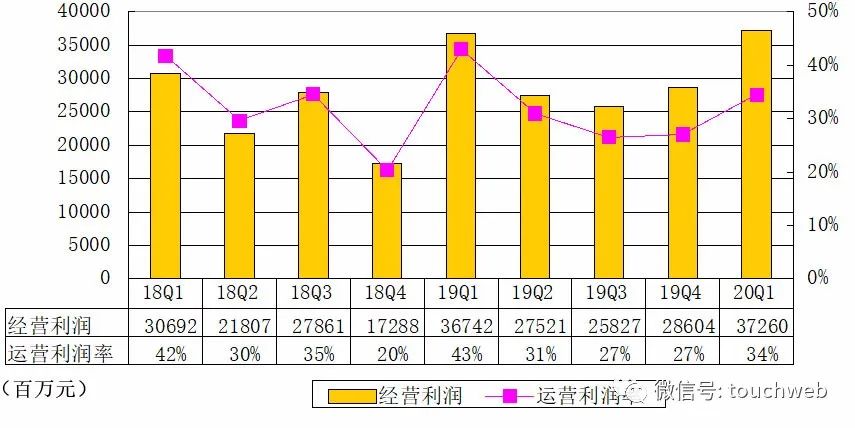 按国际财务报告准则,腾讯2020年第一季度经营盈利为372.6亿元(52.59亿美元),同比增长1%;经营利润率由去年同期的43%下降至34%。
