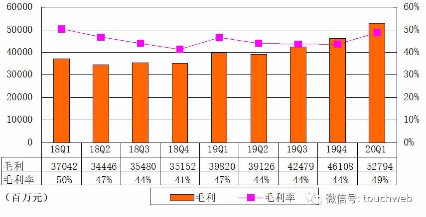 腾讯2020年第一季度毛利为527.94亿元,毛利率为49%,上年同期为47%,上一季度为44%。