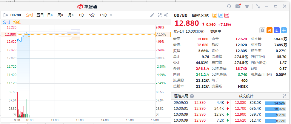 新浪港股讯 5月14日消息,同程艺龙逆市大涨7.32%,报12.9港元,最新市值达275亿港元。