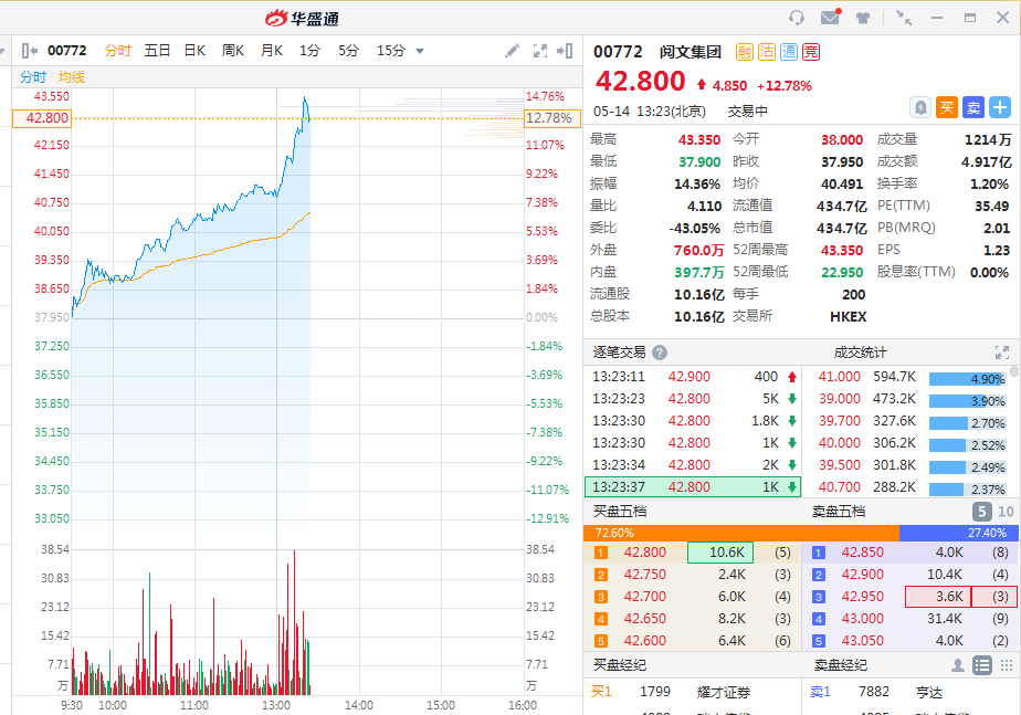 新浪港股讯 5月14日消息,阅文棘突午后涨幅扩大至13%,市值达434.7亿港元。