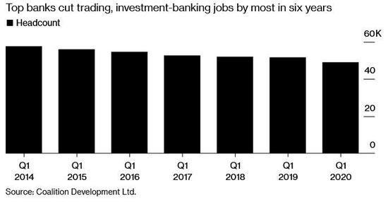 这对于那些仍在职的交易员来说是个好消息。联合发展有限公司(Coalition Development Ltd.)的数据显示,今年第一季度,全球最大的几家银行削减了5%的交易和投资银行职位,为六年来的最高水平。