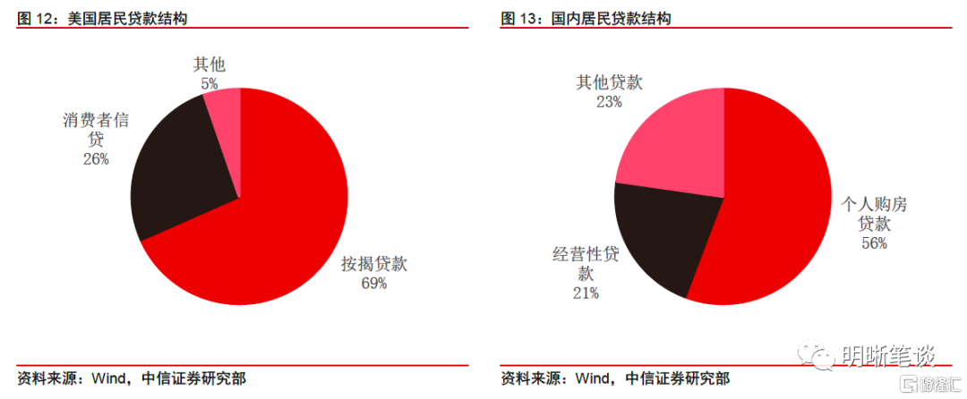 未来房贷和消费贷占比有一定的提升空间。国内居民贷款的结构中,经营性贷款占比偏高,消费和房贷占比相对偏低。从购房贷款方面看,国内居民的房贷占总贷款的比例仅有56%,而美国住房按揭贷款的占比为69%,相比之下国内居民购房贷款的占比偏低。过去房价快速上涨,居民买房需求旺盛以致购房杠杆快速上行。虽然近年来新房销售增速放缓,但这并不意味着居民的购房杠杆触顶。相反,在房价已经上涨到高位,叠加“房住不炒”的情况下,从2018-2019年的市场表现看,二手房挂牌出售热度明显上升,二手房价也明显跑输新房,二套房主的供给压力可能会使二手房市场维持稳定的成交量,使居民杠杆率继续维持升势。消费贷方面,我国居民超前消费的意识并不强烈,但是随着未来消费在国民经济中的重要性不断增加,(1)一系列的政策鼓励,(2)金融工具(信用卡、白条等)的创新和普及(3)消费观念的改变可能会带来居民超前消费意识的提升。